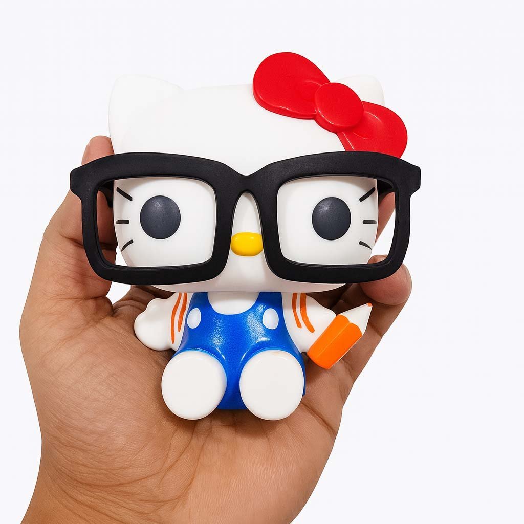 Celebrate your love for books with this charming Hello Kitty collectible figure! Featuring oversized black glasses, a book in hand, and classic blue overalls, this figure captures the perfect “smart and cute” vibe.