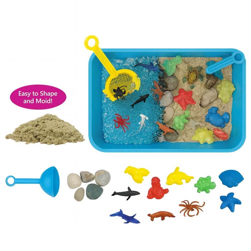 Contents Include: 1 Play Tray (Ocean & Sand themed), 1 Bag of Kinetic Sand, 1 Bag of Water Beads, 1 Shovel & 1 Strainer, Assorted Rocks, 12+ Ocean Animal Figures & Molds (crab, starfish, shark, dolphin, turtle, etc.)