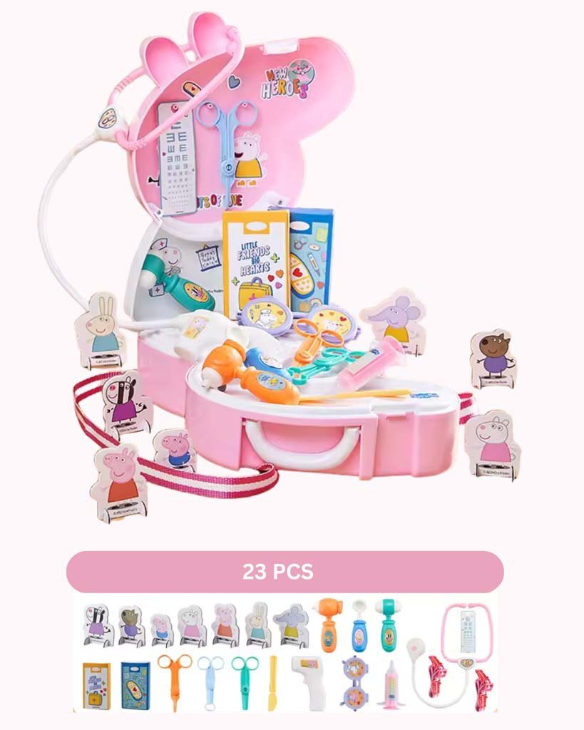 Let your child step into the world of pretend play with this adorable Peppa Pig Doctor Backpack! Packed with kid-friendly medical tools like a stethoscope, syringe, thermometer, and more, it encourages creativity and role play while boosting social and motor skills. The colorful backpack makes it easy to store and carry — turning playtime into endless doctor adventures!